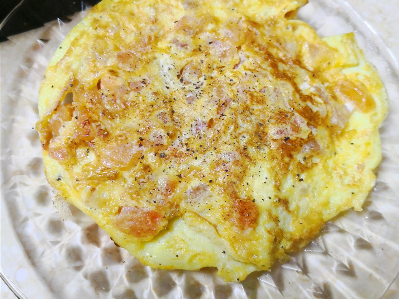 يخفق البيض مع ملح وفلفل اسود حتى يتجانس ثم يصب على الطماطم ويترك على شكل قرص ويترك حتى يستوي ثم يقلب على طبق ويرجع على المقلاة ويترك حتى يستوي ثم تقدم