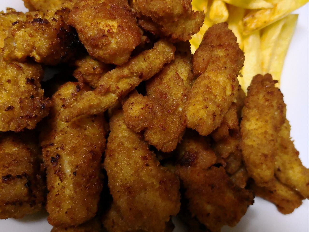 4صدور دجاج مقطعة اصابع رفيعة ومغسولة ومنقوعة في ماء وخل لمدة ربع ساعة وتصفى