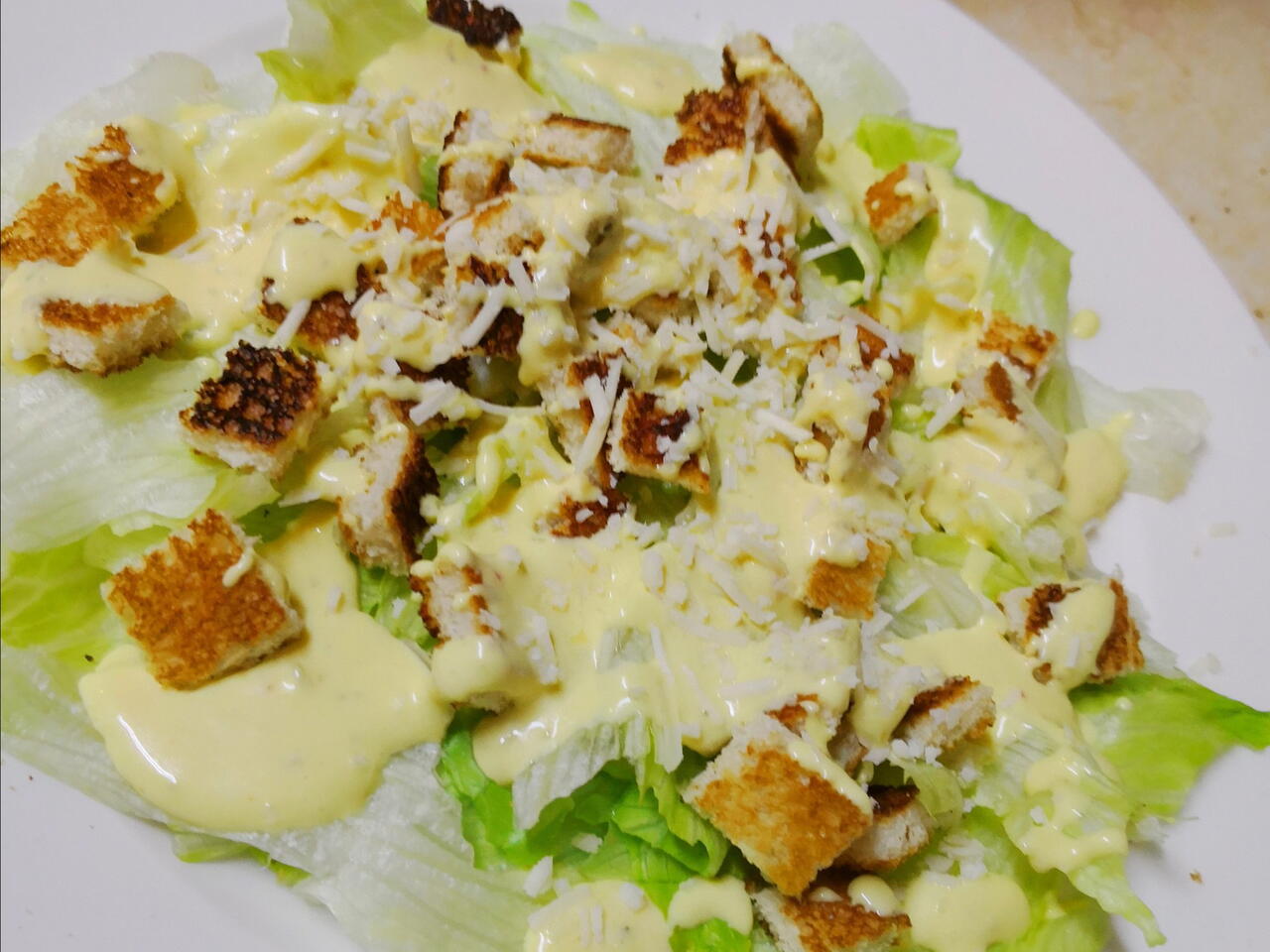 يوضع في طبق التقديم الخس وعلية الخبز ويرش بالجبنة