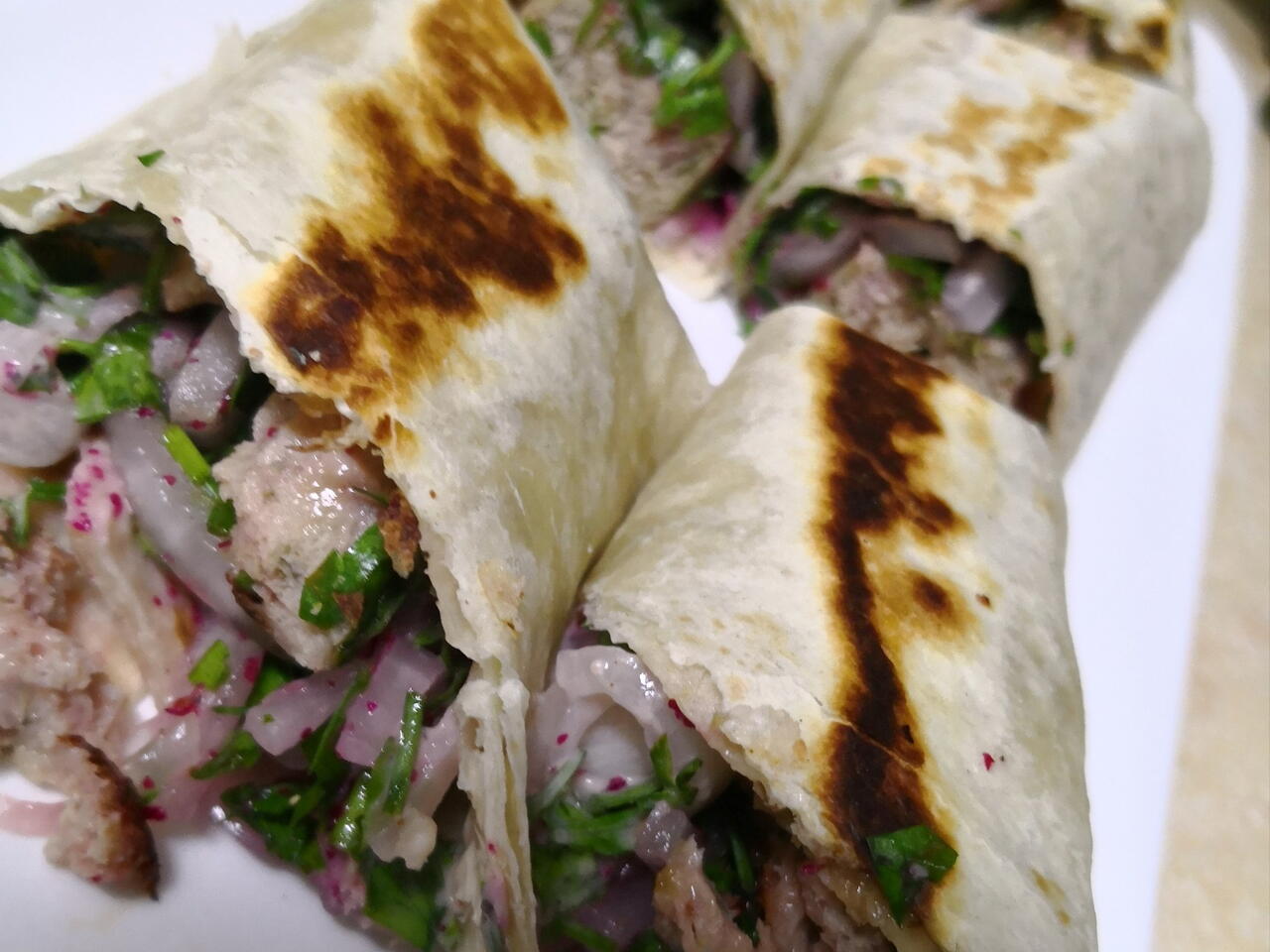 نأتي بالخبز ويدهن بالصوص ويوضع الخضار ويوضع الكباب ويلف رول