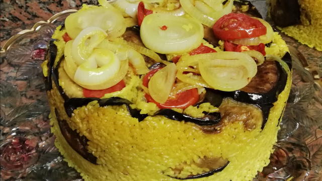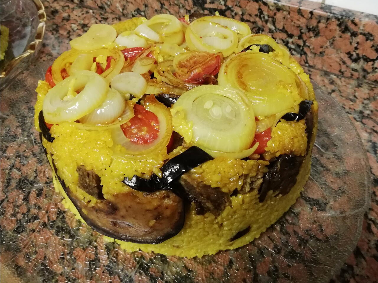 اول حاجة بنسلق اللحمة بالطريقة العادية وبعد ماتستوي نقطع البذنجان بالطول او حلقات ونقلية في الزيت وبعدين نركنة علي جمب ونقطع البصل والطماطم حلقات نجيب حلة نحط فيها زيت ذرة وبعدين نرص الاول البصل وبعدين حلقات الطماطم وبعدين البذنجان وبعدين نحط اللحمة وبعدين نحط الرز نجيب بقي شوربة اللحمة نحط فيها ملح وبهارات ومكعب المرقة ورشة الزعفران والقرفة ونقلب كلة ونسقي الشوربة فوق الرز لحد مايغطي الرز وبعدين نحطها علي النار لحد مايغلي والرز يشرب الشوربة نوطي علية لحد مايستوي الرز نقفل عليها نحضر سرفيس كبير
