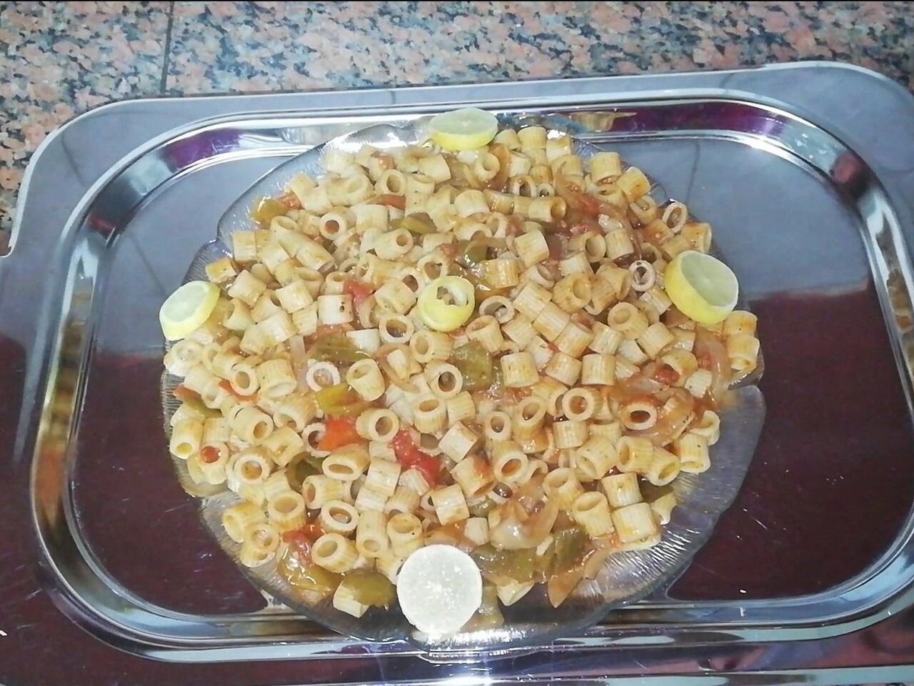 بنسلق المكرونة وبعدين بنجيب حلة بحط الزيت وبعدين بحط البصل يحمر شوية انزل بالفلفل يدبل شوية انزل بالطماطم والصلصة وبحط شوية ماية مغلية واقلب كلة مع بعض يغلي كلة احط كل التوابل بتاعتنا وبعدين يغلي اوطي النار اسيبها ربع ساعة كلة يستوي وبعدين اظبط الملح لو محتاج تاني وبعد كدة انزل بالمكرونة واقلب كلة مع بعض وبعدين اقدم في الاطباق والف هنا وشفا