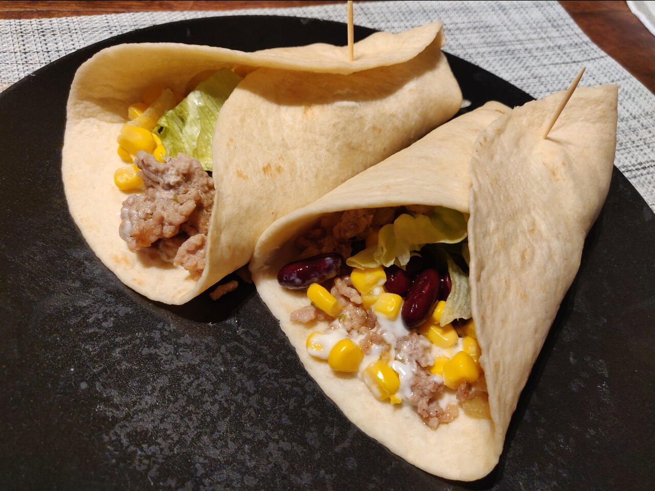Schep een beetje rijst op de onderste helft van de tortilla, gevolgd door een paar schepjes gehakt, wat sla, mais, zwarte bonen, stukjes tomaat en rode ui. Rol de tortilla een stukje op en vouw de zijkanten naar binnen. Rol verder op.