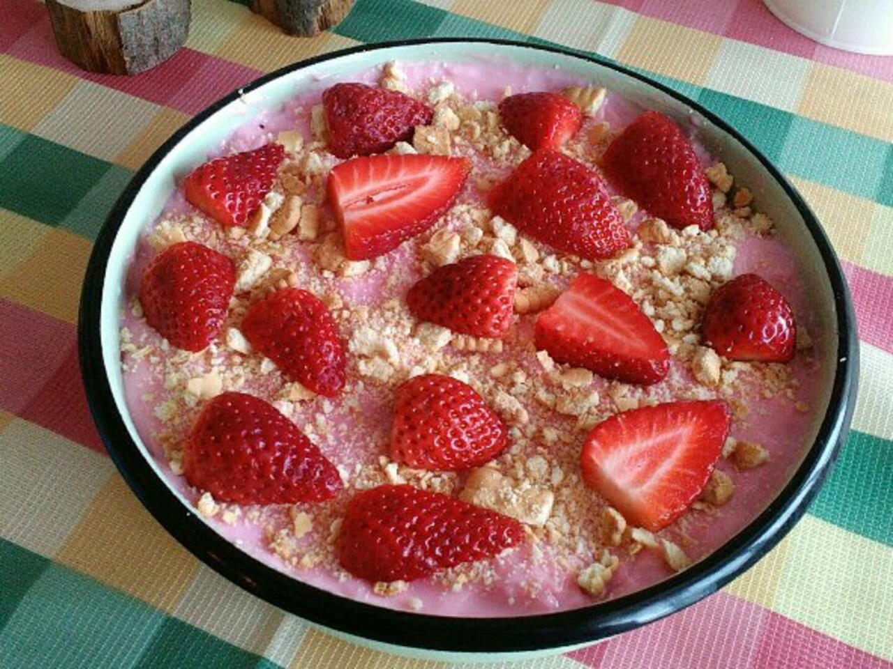 Украсява се по желание - в случая натрошена бисквитка и ягоди.