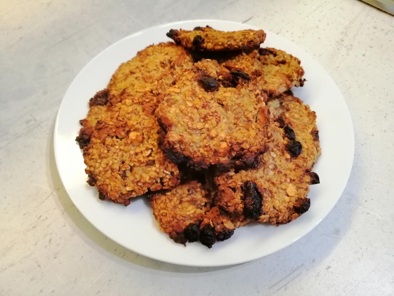 Бананите се намачкват, добавят се натрошените ядки, меда, стафидите и накрая овесените Ядки. Разбърква се добре и с помоща на лъжица се оформят бисквити върху хартия за печене. Печем на 200 градуса за около 15 минути :)