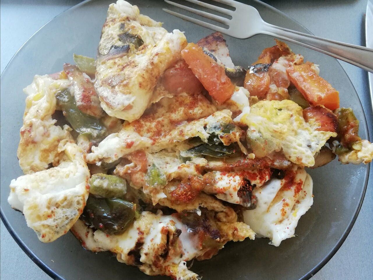 Аз използвах 2 цели яйца и белтъка от 3 яйца . Разбъркваме яйцата добре и след като всичко в тигана е готово ги изсипваме вътре .