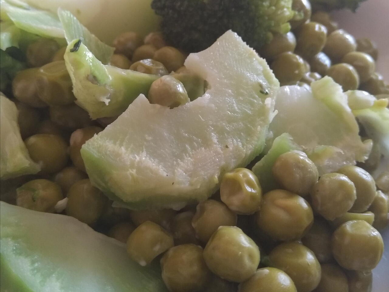 Смесвам с половин буркан грах от консерва, като овкусявам с зехтин и малко сол.