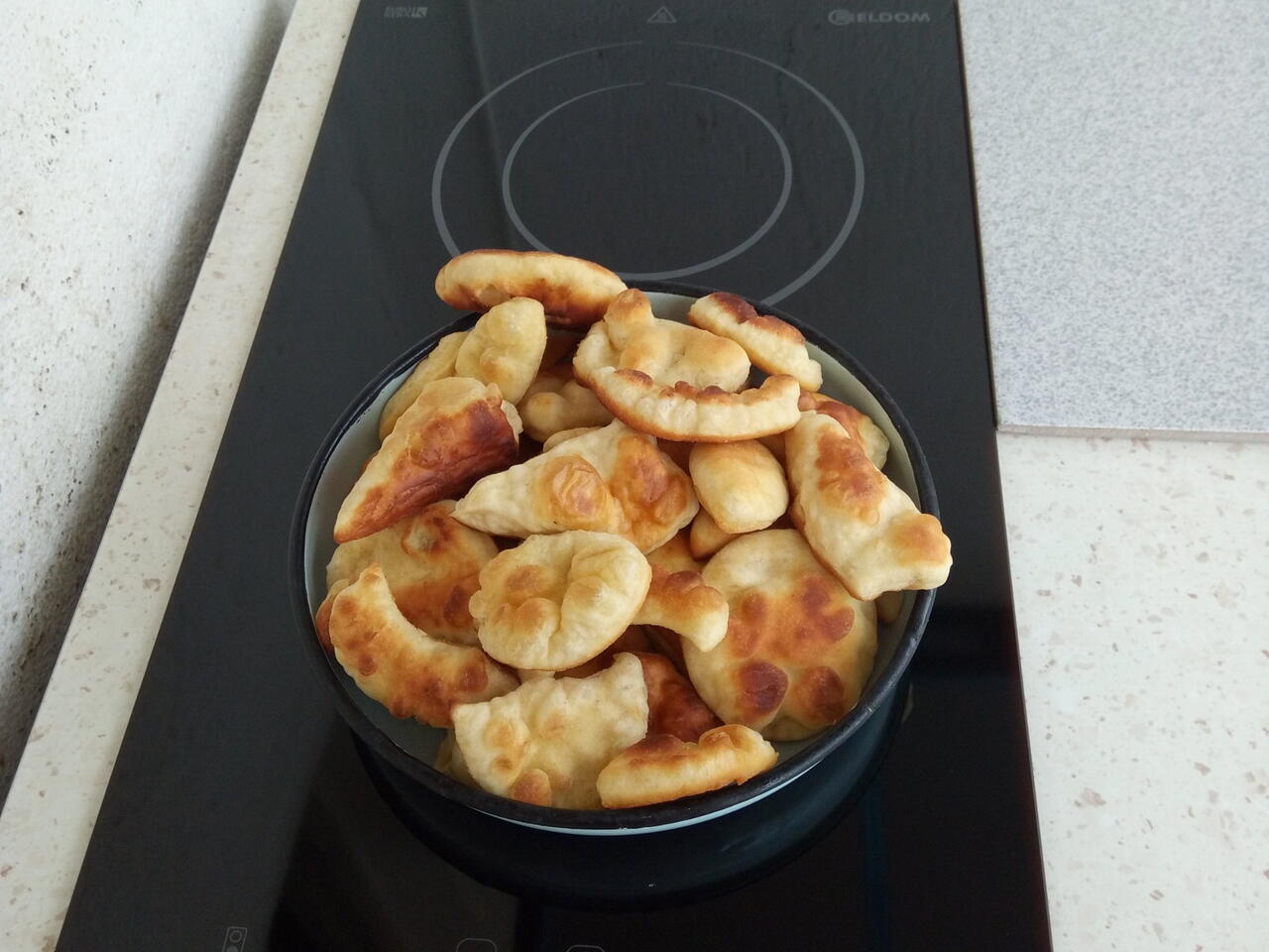 Включете олиото да загрява в подсушен тиган или тенджера. Докато олиото загрява, приготвяме тестото. В купа слагаме млякото и в него загасяме содата, разбъркваме хубаво . Слагаме и яйцето, солта, захарта и есенцията, отново разбъркваме и постепенно добавя брашно.Щом се сгъсти достатъчно, спираме да бъркаме и започваме да месим и да добавяме брашно до получаването на меко тесто.Готовото тесто разточваме на не много тънка кора, режем на квадратчета или ромбчета и пускаме в загрятото олио.