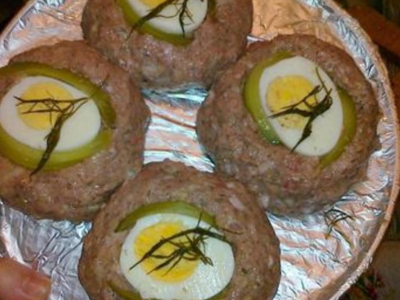 1Каймата се приготвя като за обикновени домашни пържени кюфтета, което означава, че ако някой има друг метод на приготвяне - не е грешно да не следва моята рецепта.2Това, което обаче съветвам, е да се настърже един картов в сместа, защото неговото присъствие прави после гнездата по-пухкави, а и вкуса става малко по-различен (по – приятен).3Оформят се топки, в които се правят малки вдлъбнатини, където се слага плънката.4Плънката е по избор : варено яйце, кисели краставички, бланшира