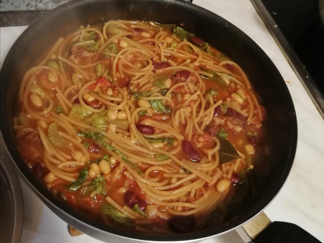 След като сме направили всичко отгоре , остана само да добавим пастата и листата от зелето . Избираме някаква паста ,слагаме я в тигана и чакаме 12 Мин докато стане готова . 5 Мин преди да извадим всичко ,слагаме и нарязаните листа от зелето . Това е