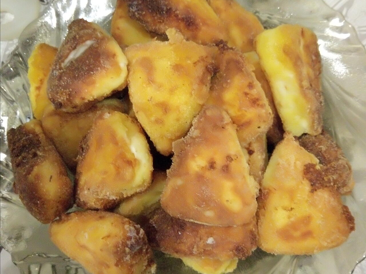 Топеното овалваме първо в брашното,след това в яйцето и накрая в картофеното пюре . След което после пържим до златисто .