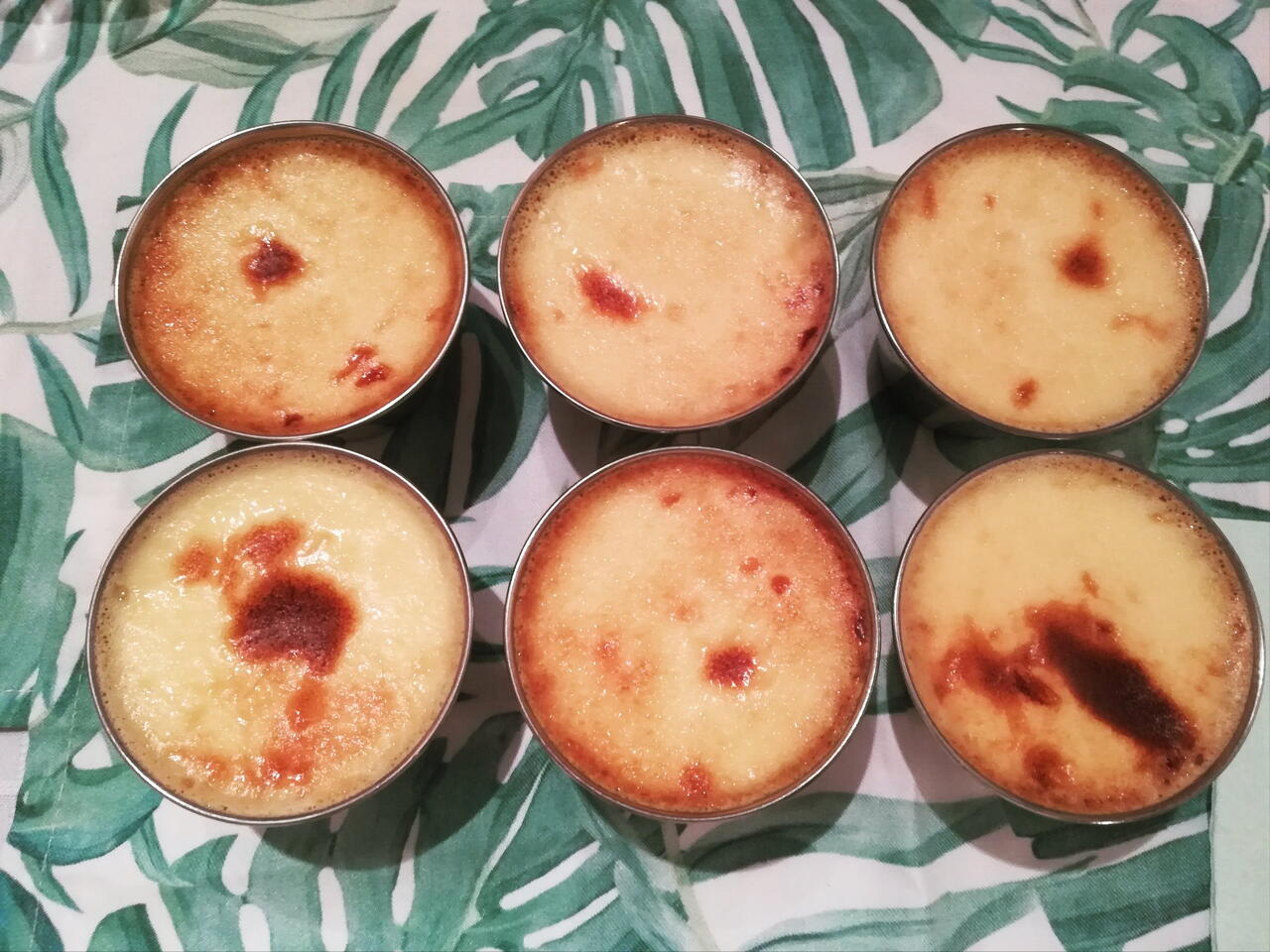 В отделен съд се слагат супените лъжици захар и лимонов сок. Загрява се на котлона, първо на по-ниска температура, после на по-висока, докато не се разтопи напълно захарта и не покафенее сиропът - става карамел. Разпределя се на дъното на купичките.