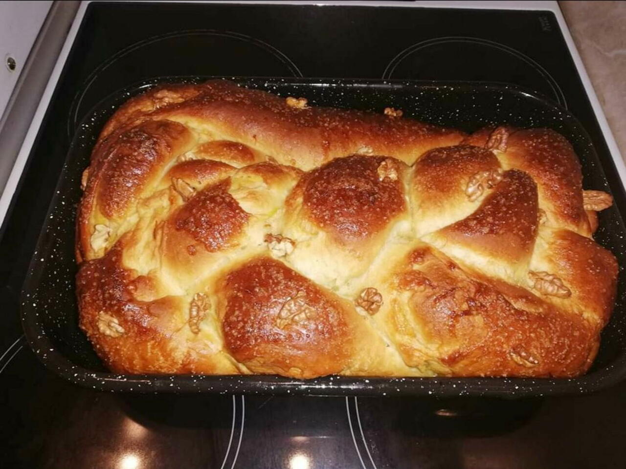 След първото втасване премесваме отново и разделяме на равни топчета,които разточваме и навиваме на руло,след което оплитаме. Оставяме да втаса втори път вече оплетен около 30-40мин. Намазваме с белтък и поръсваме със захар.