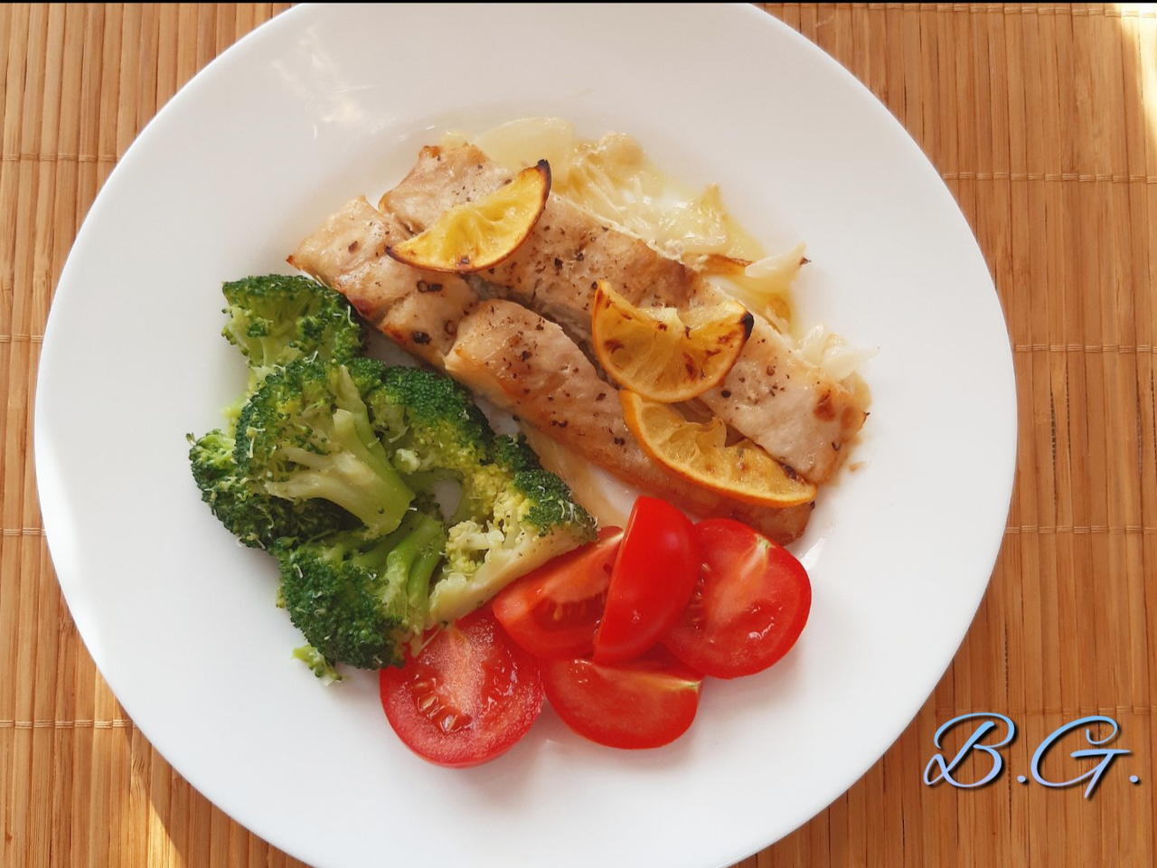 Нарежете главата броколи на средно големи розички. Варим около 6-8 мин. във вряща подсолена вода. След като са готови веднага правим шок баня със студена вода, за да се запази цвета им. Върнете пак броколите на слаб котлон в тенджера с разтопеното масло, малко сол и черен пипер. Задушаваме за няколко минути. След като рибата и броколите са готови сервирайте топли, може да добавите и няколко чери доматчета. Bon appetit!🥂