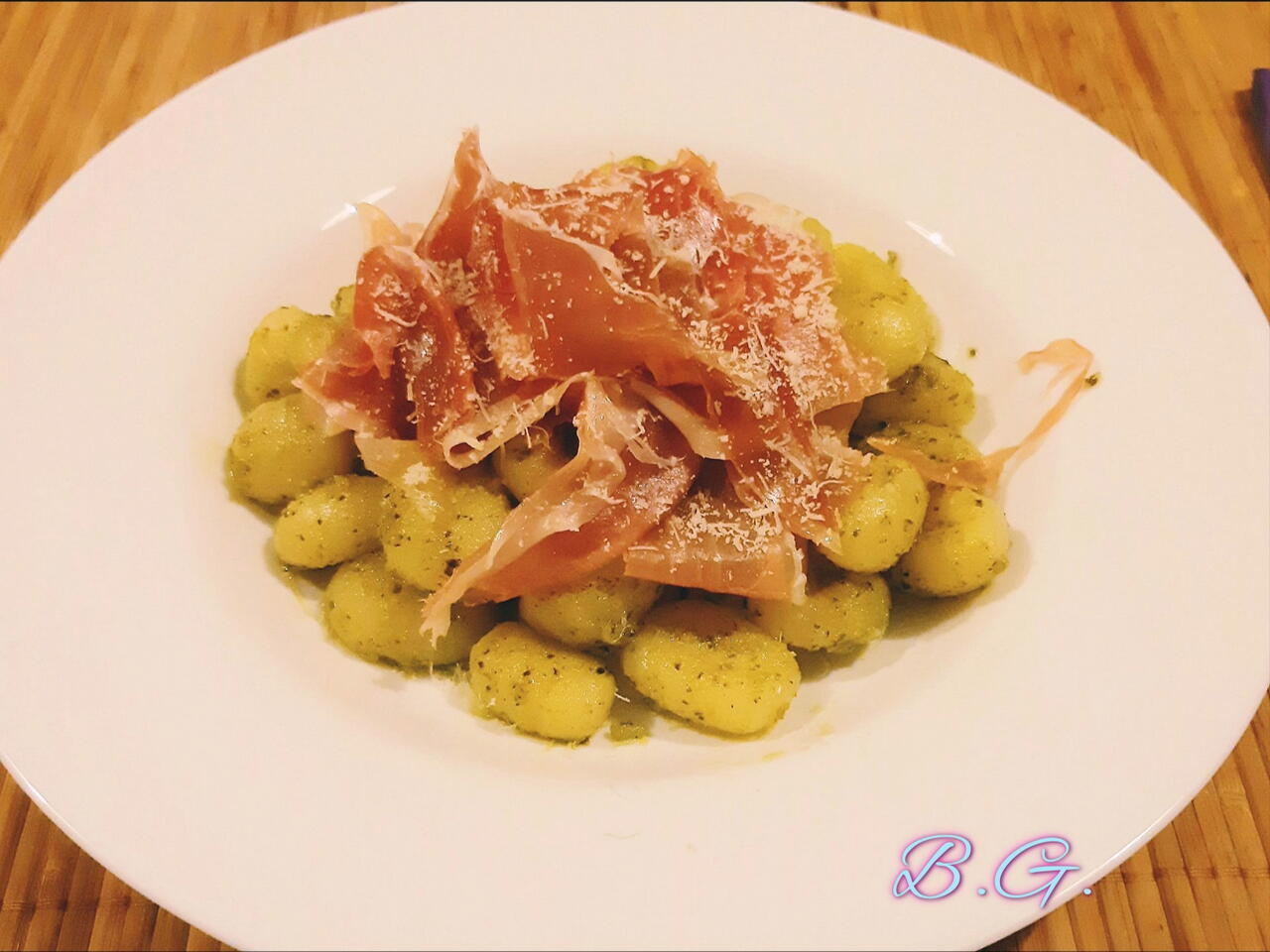 След като са сварени, отцедете ньоките от водата и върнете тенджерата на слаб котлон. Добавете няколко лъжици песто (колкото ви е вкусно) и след това разпределете в чинии с прошуто отгоре и поръсете хубав пармезан. Наздраве! 🥂
