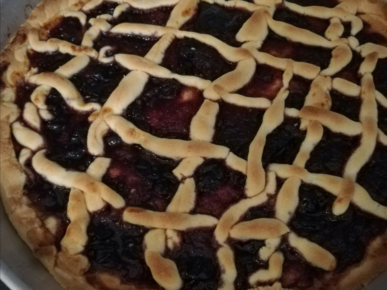 Отгоре се маже със сладко и най-отгоре се оформя решетка от заделеното тесто.