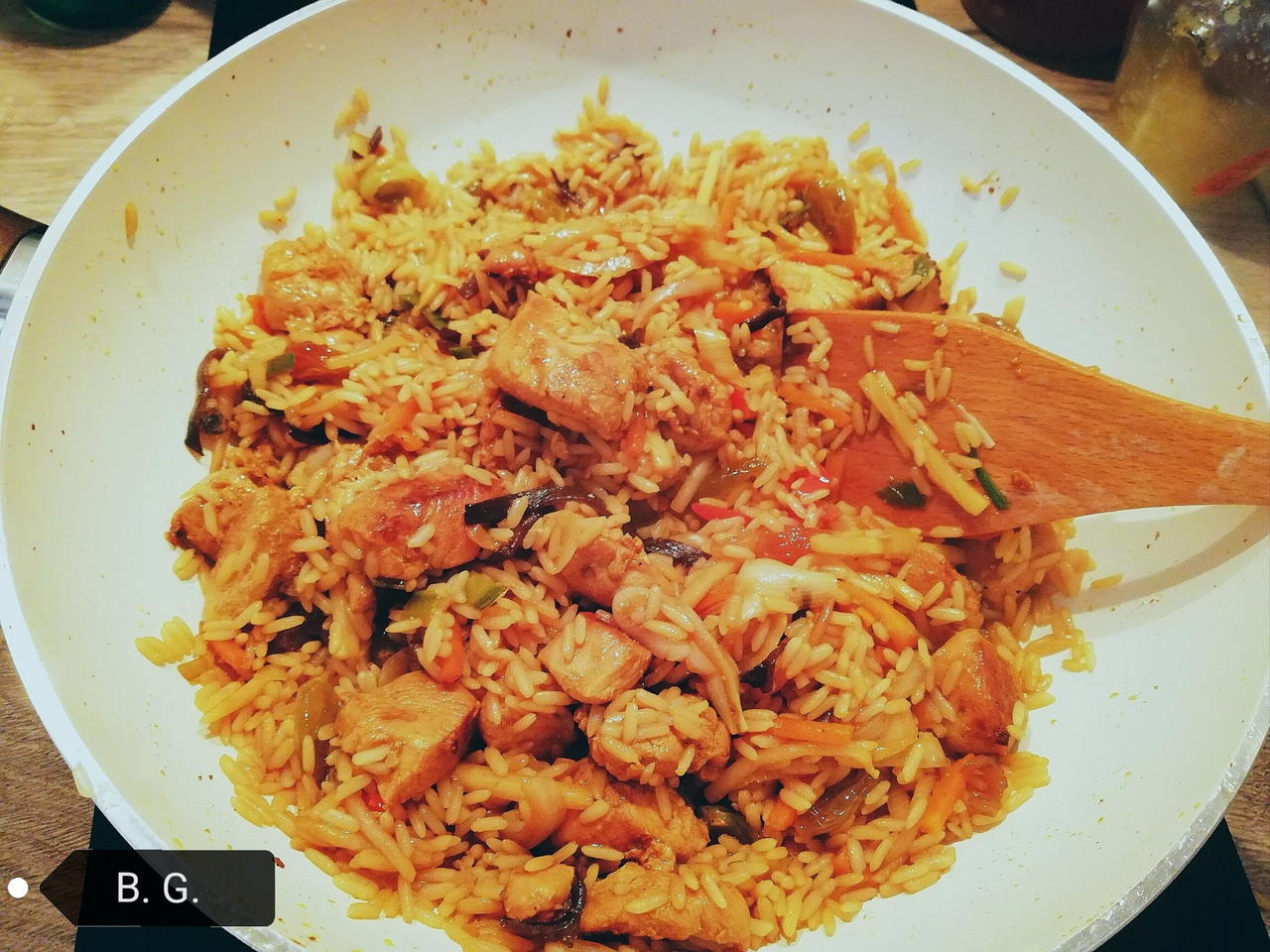 След като е готов ориза добавете зеленчуците, разбъркайте, след това добавете и пилешкото. Бъркайте до хомогенна смес. Бон апети!