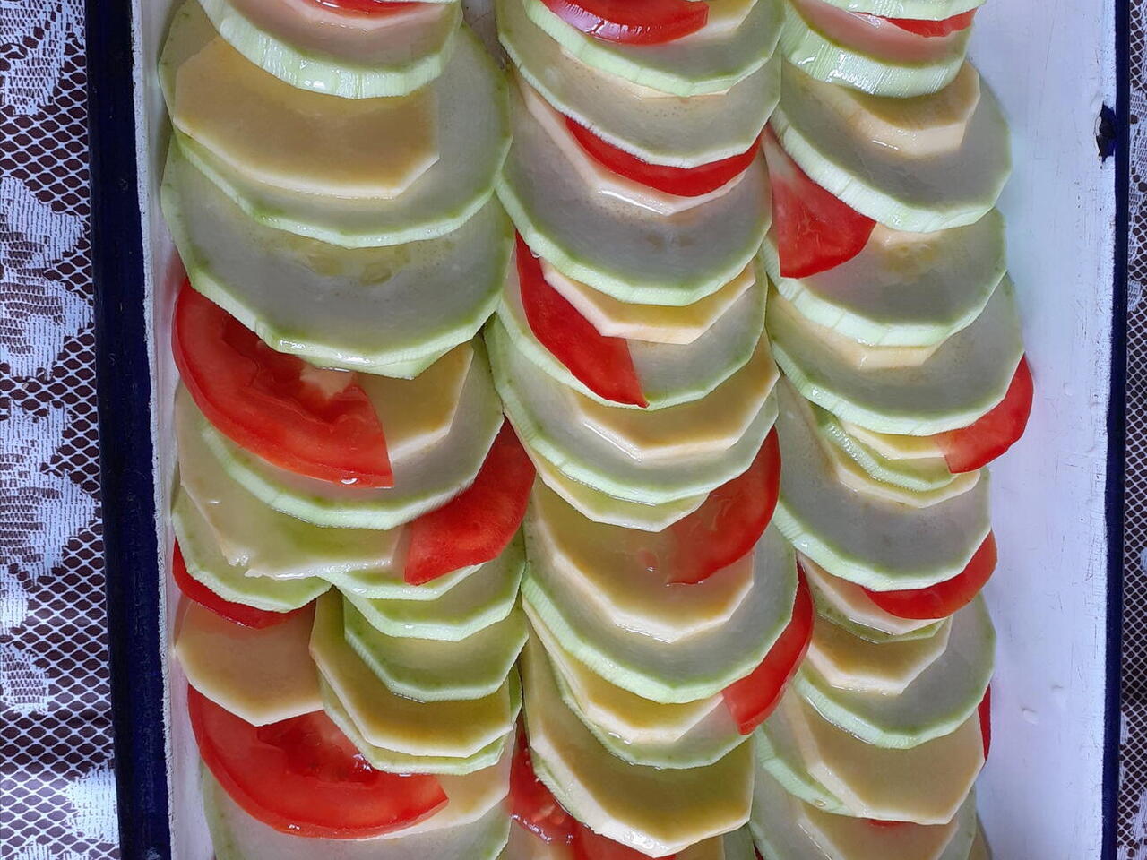 1.- Нарежете тиквичката, картофите, и домата на резени.Подредете ги по ваш избор.
