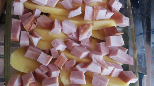 Нарежете картофите на кръгчета и ги подредете в тава.