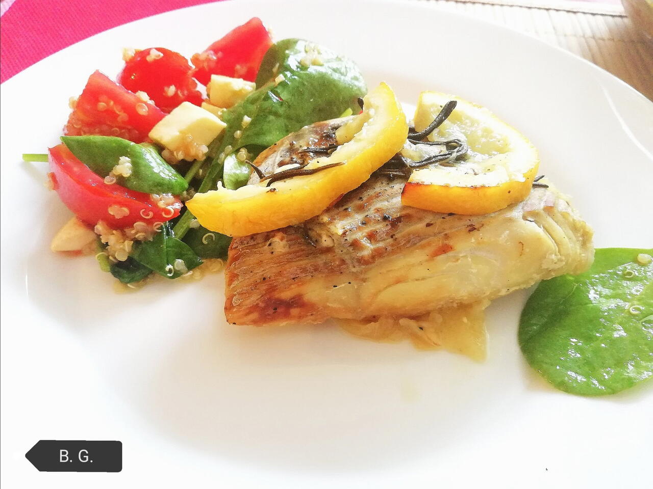 Готовата риба се изважда и аранжира в порции. За салатата се смесват киноата , спанака и останалите продукти, нарязани на ситно. Овкусява се на вкус. И готово! 🍽️