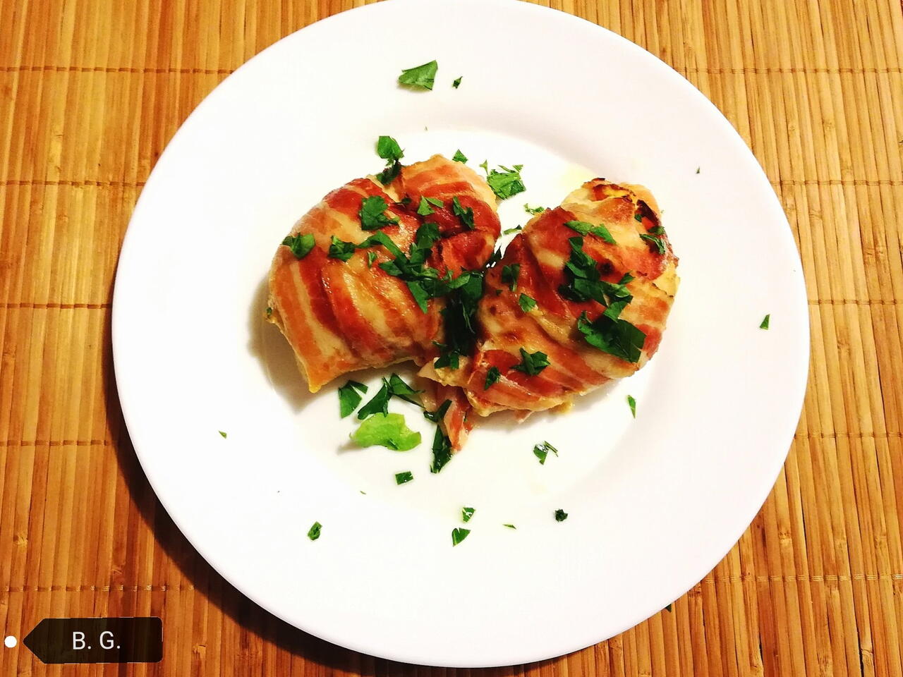 Нарежете пилешките филета напречно и начукайте, за да станат по-лесни за навиване. Всяко филе поръсваме със сол, черен пипер и къри. Нареждаме листче чедър и чери доматчета, разполовени. Внимателно завиваме рулцето и захващаме с клечки за зъби, ако е необходимо. След това увиваме с лентите бекон.
