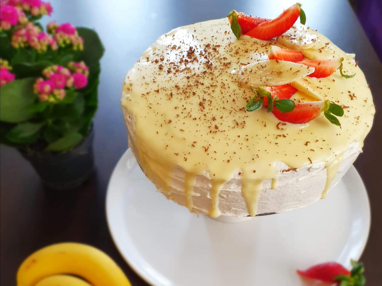 Белия шоколад заедно с 50гр. сметана се разтапят на водна баня или в микровълнова фурна до получаване на ганаж. Готовия шоколадов ганаж се излива върху тортата и се украсява с банани и ягоди.