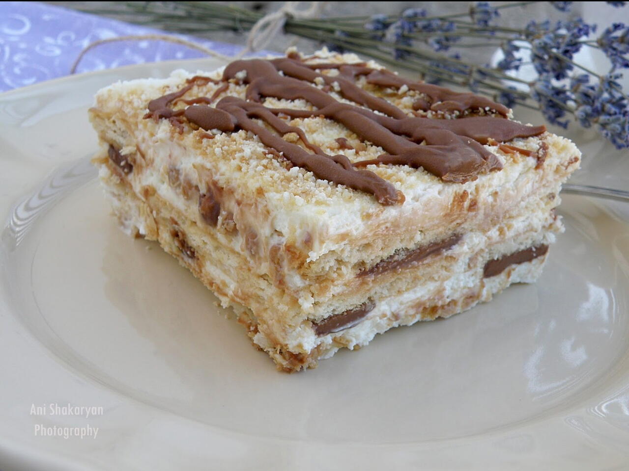 Потапяме бисквитите в прясно мляко.Нареждаме на един ред. Слагаме от крема и шоколада, така докато наредим висчки бисквити ,крем и шоколад.