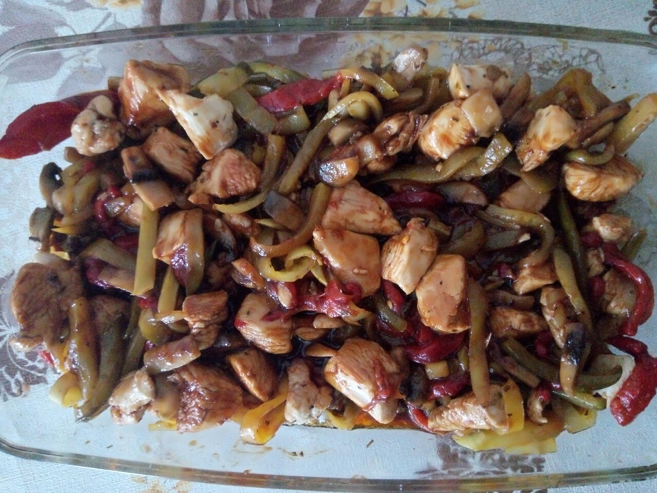 После е ред на месото да се запържи до златисто ... След това започваме и соса .... Изсипваме оцета който сме приготвили, в тигана който е все още е на котлона . Оставяме да се поизпари малко след което добавяме и захарта после и кетчупа разбиваме и получаваме полугъста смес. С която заливаме пилето и зеленчуците.