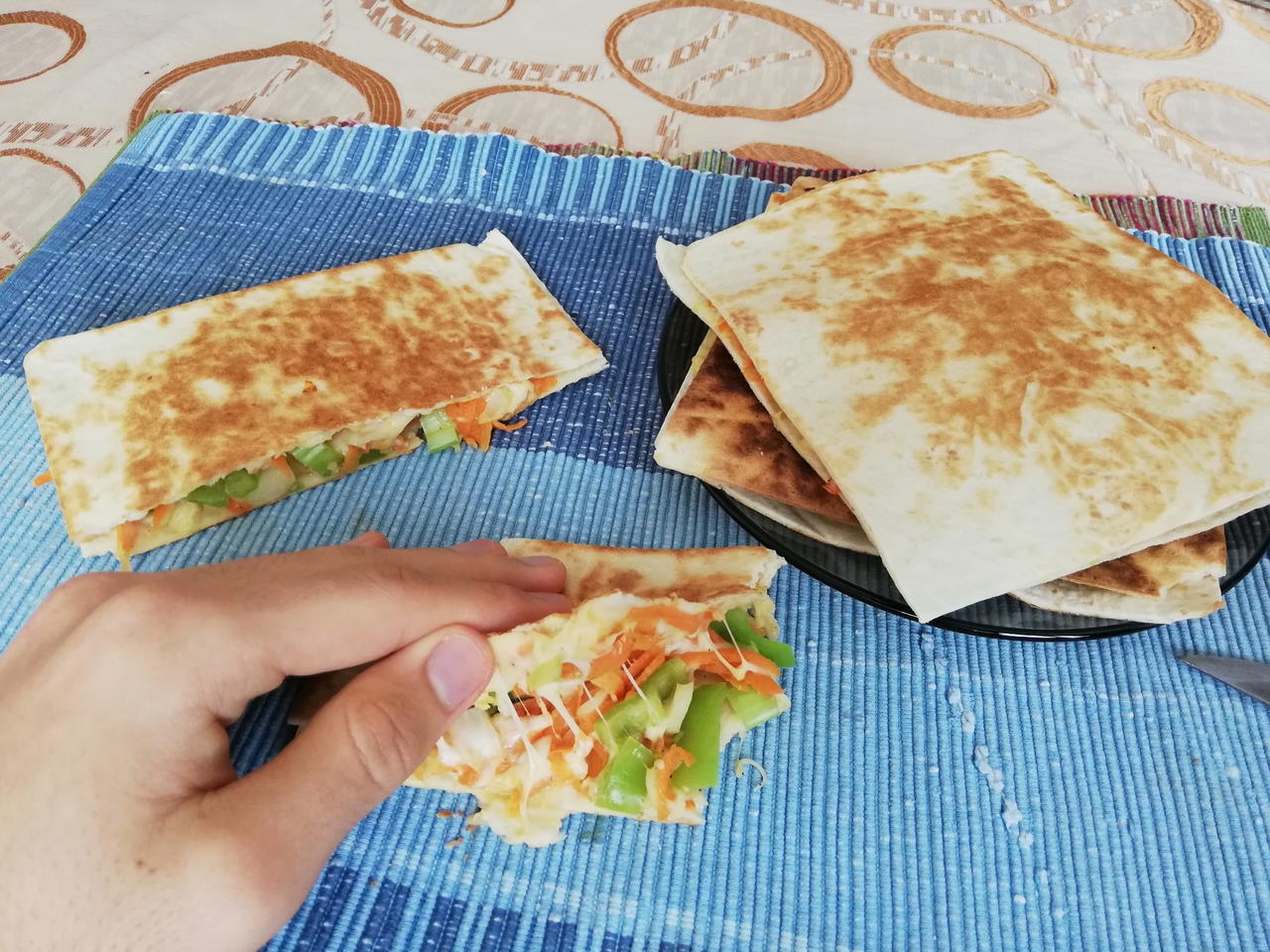 След като плънката е готова . Вземаме тортиля , слагаме върху нея плънката и след това слагаме отгоре още една тортиля . Вземаме този сандвич от тротили и го слагаме в не залепващ тиган на среден огън за да може плънката да се затопли добре . Държим всяка страна докато не стане жълта или кафява / 2 Мин . И готово можем да сложим отгоре кисело мляко или някъде друг сос .