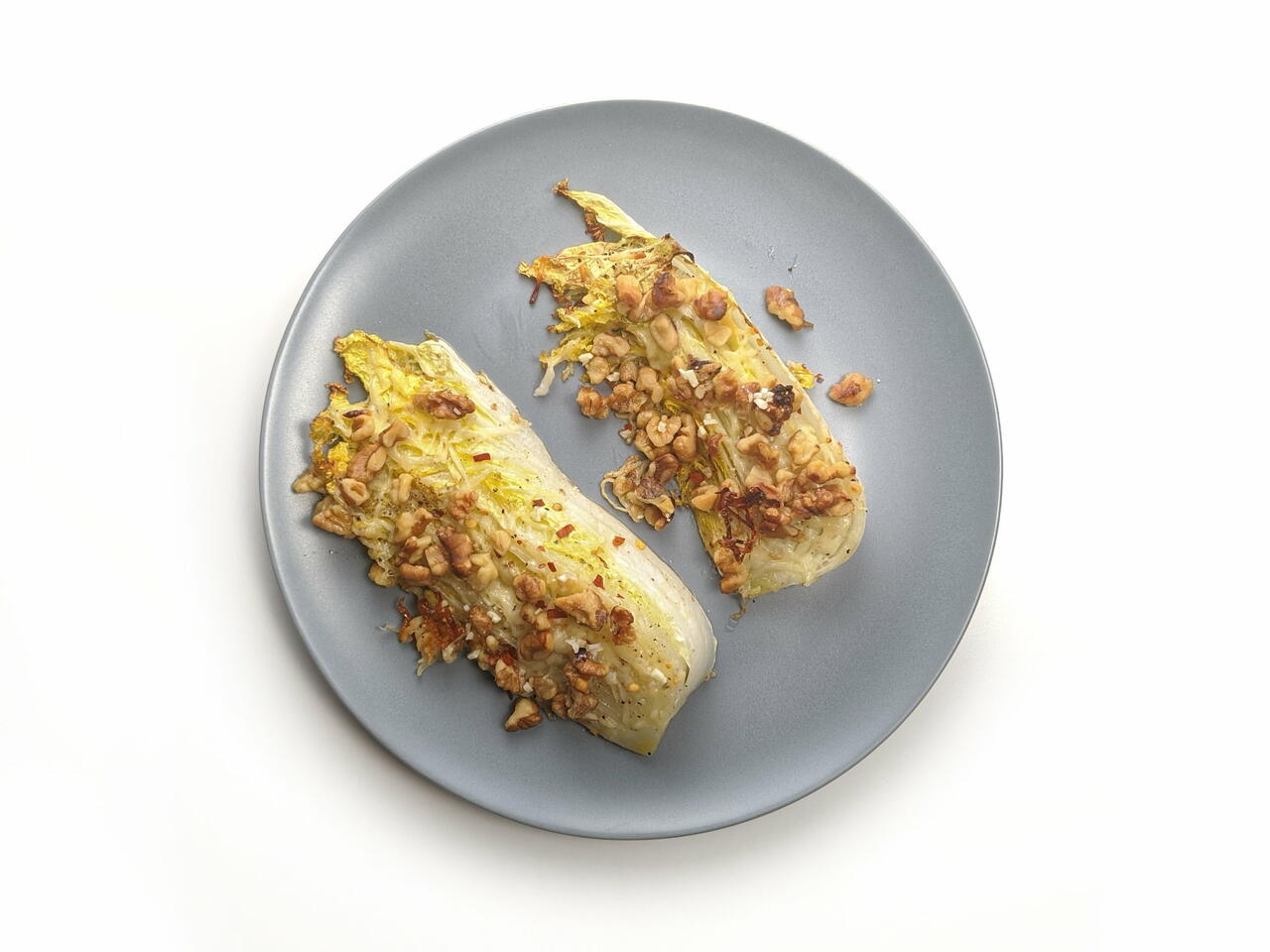 Uma acelga inteira, assada em fatias e coberta com nozes, alho, pimenta calabresa e parmesão. A acelga pode ser um alimento meio sem graça. Esta é uma forma divertida de deixá-la mais interessante.