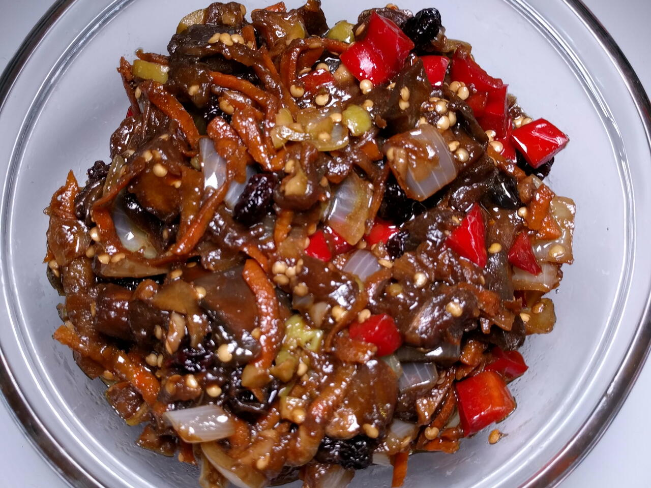 Em outra panela colocar um pouco de óleo, fritar a cebola, adicionar umas colheres do shoyu, deixar apurar e colocar na panela das beringelas;