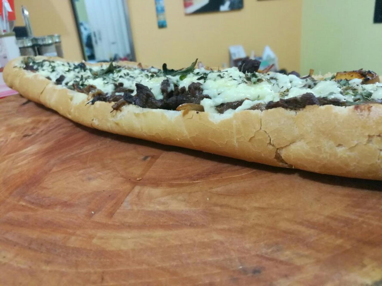 Fritar a carne ,fazer uma cavidade no meio da baguete ,tirar o miolo ,fazer uma cama com pedaços de queijo em seguida agregar a carne e por ultimo queijo por cima ,orégano manjericão e azeite