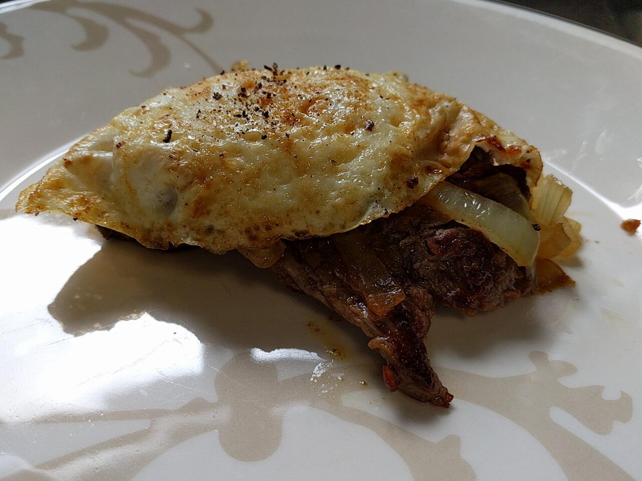 Colocar as cebolas em cima dos bifes. Os ovos em cima da cebola. De uma pitada com pimenta do reino e sirva.