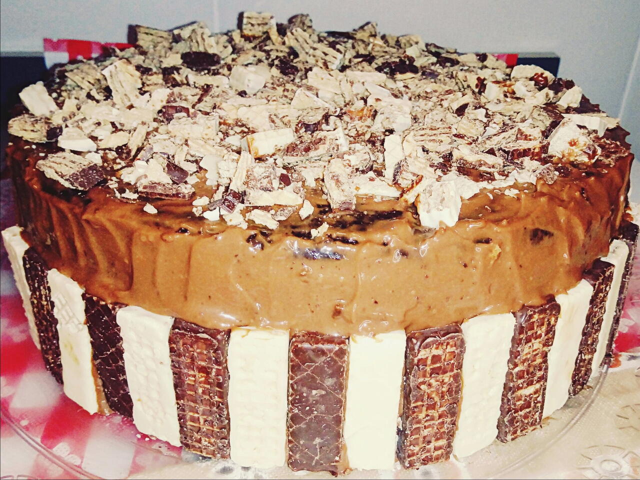 Um bolo prensado de chocolate com uma massa maravilhosa bem macia e fofa,molhada com uma calda de chocolate.também com recheio de mousse de chocolate com bis, e uma cobertura de ganache de chocolate decorado com bis. Hummm muito delicioso vale a pena fazer.