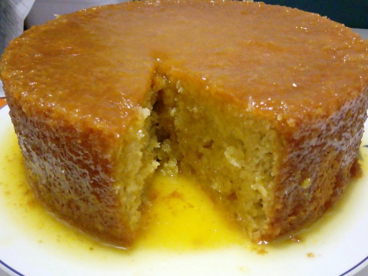 Fure todo o bolo com uma faca, ou garfo, ou palito, ou cone. Derrame a calda por cima do bolo, com a calda ainda quente ou morna.