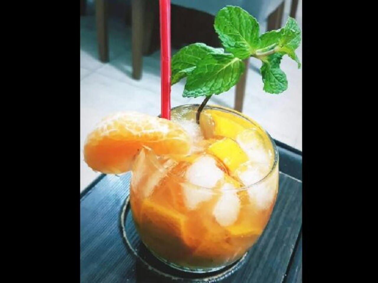 Coloque na coqueteleira a tangerina juntamente com o açúcar e macere , em seguida junte as folhas de hortelã e não macere mais.