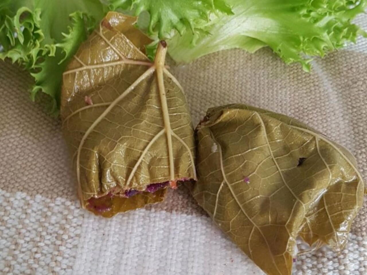 Colocar a batata amassada na folha de uva. e Na sequência acrescentar o molho com a carne e enrolar formando charuto.