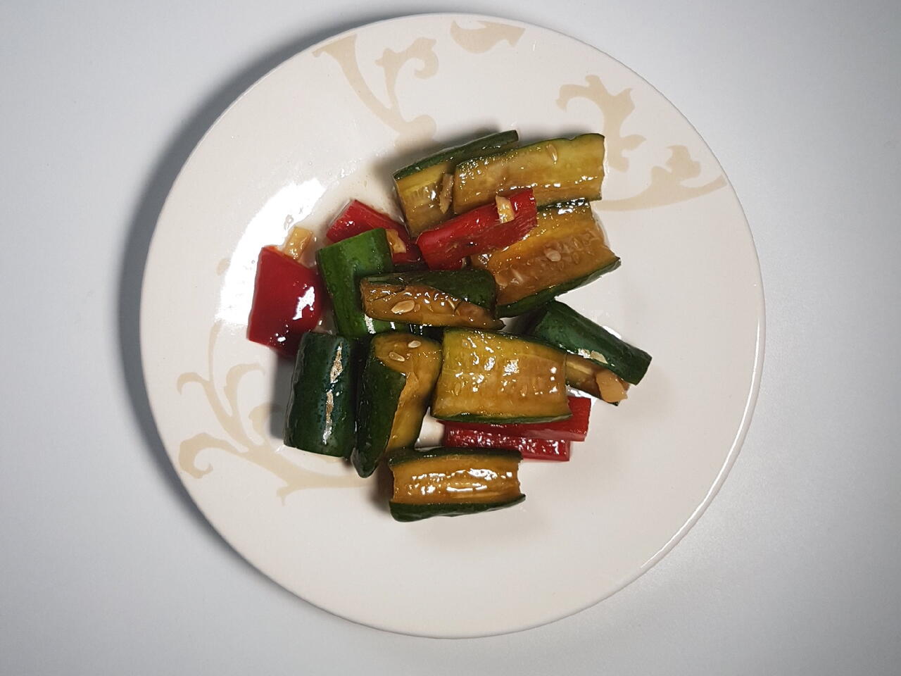 Coloque o gengibre frito sobre os pepino, acrescente o shoyu e o açúcar;