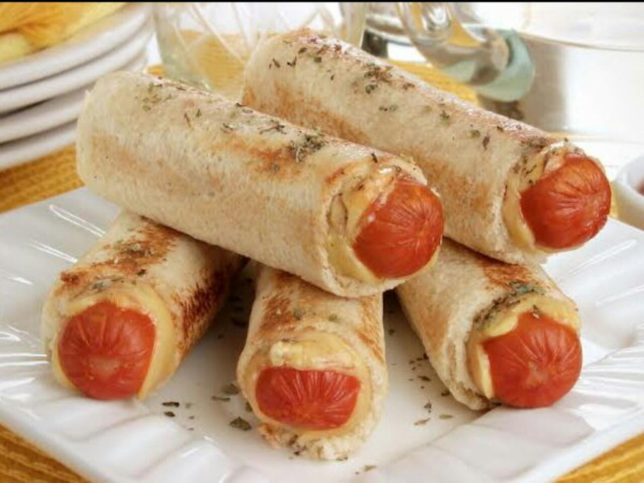 Sobre cada fatia de pão, coloque uma fatia de queijo prato e uma salsicha.