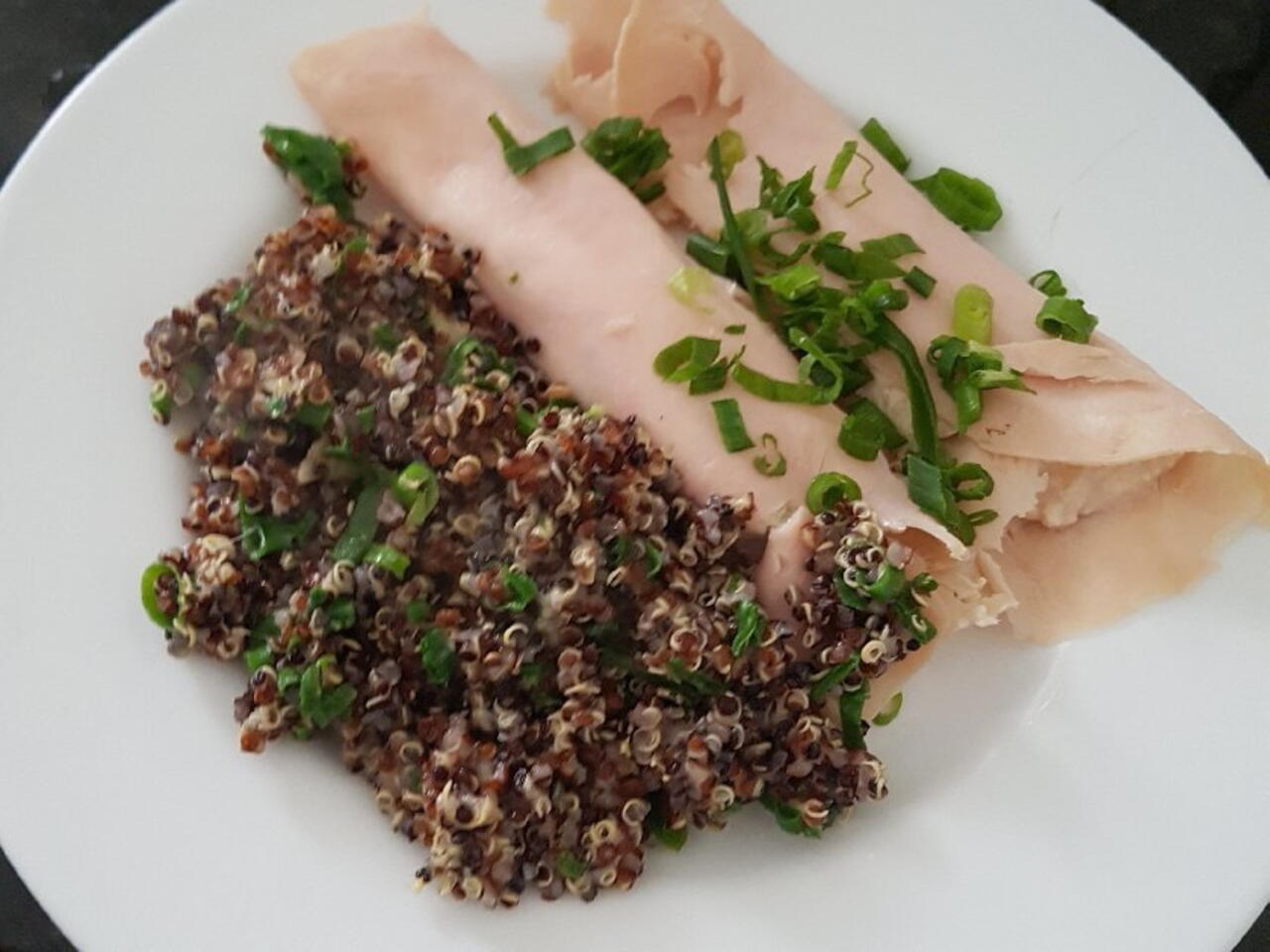 Processe a ricota com o requeijão e azeitona. Enrole na fatia de peito de peru. Para o patê de atum processe a ricota, requeijão e o atum com orégano (opcional). Sugestão de acompanhamento: salada de quinoa.