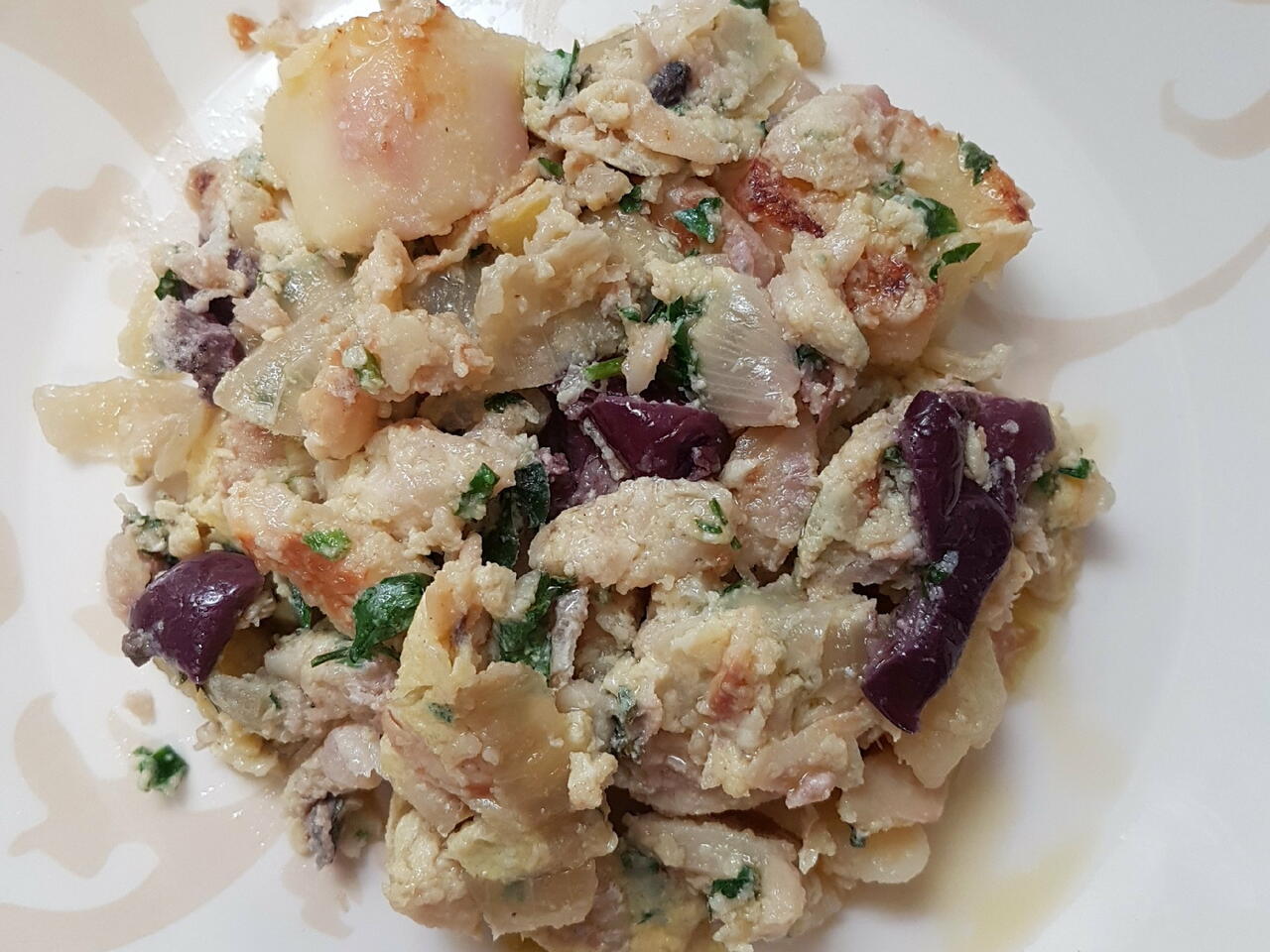Bata os ovos,colocar o cheiro verde, se precisar, sal e pimenta (reserve); acrescentar as azeitonas sem caroço e picadas;