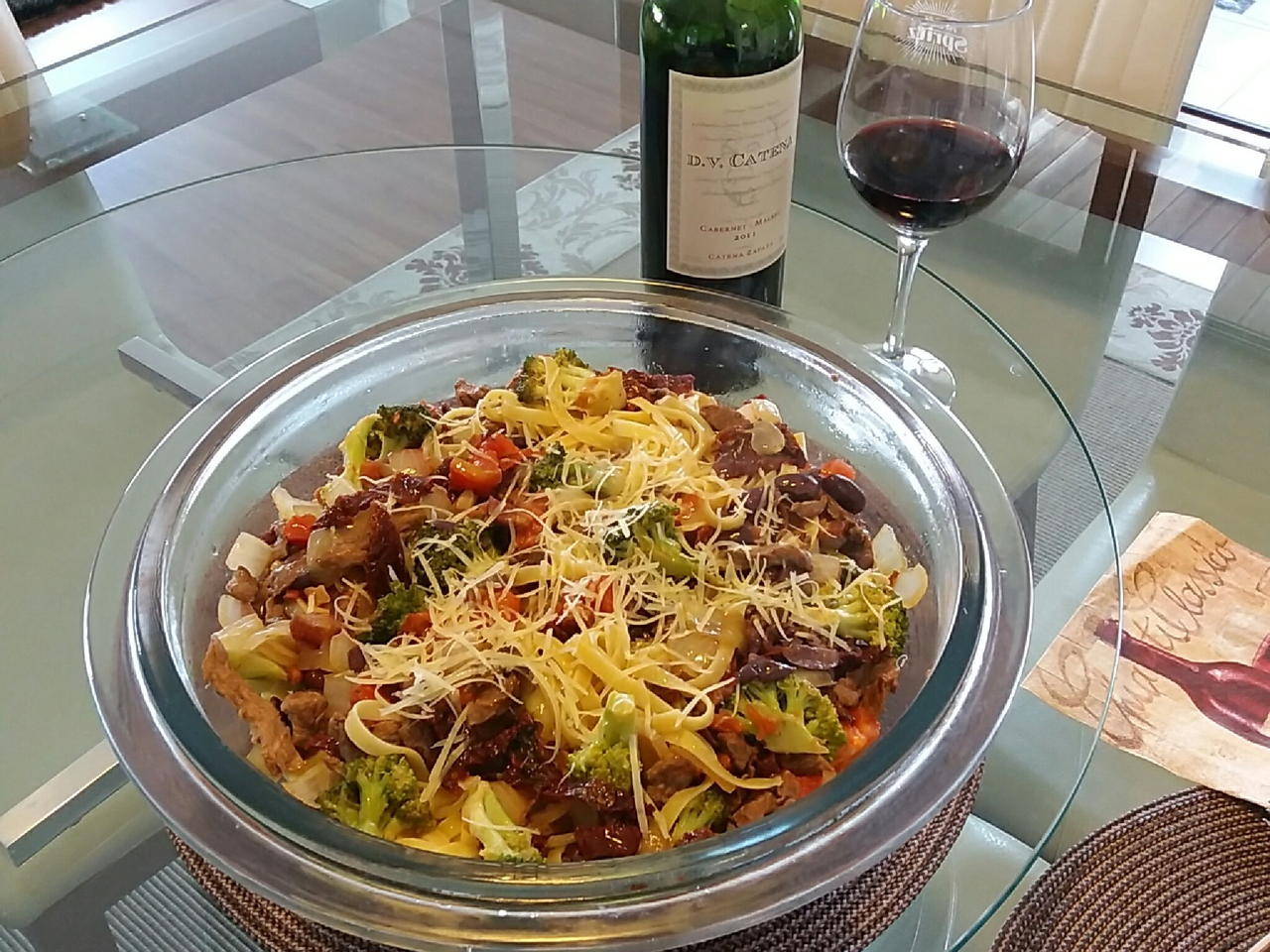 500 gramas de fettuccine grano duro 400 gramas de filé mingon 300 gramas de bacon 4 dentes de alho 2 tomates maduros 2 cebolas 1 brócolis 150 gramas de azeitonas pretas 150 gramas de tomate seco Tempero pronto à gosto