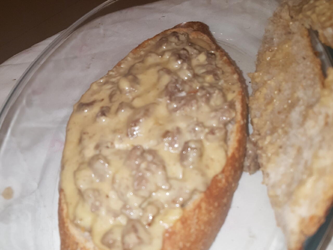 Depois de frita, separar a carne em uma vasilha e utilizar a panela (queimada da carne) para fazer o molho. Fazer o buraco no pão e aquecer no forno durante 5min.