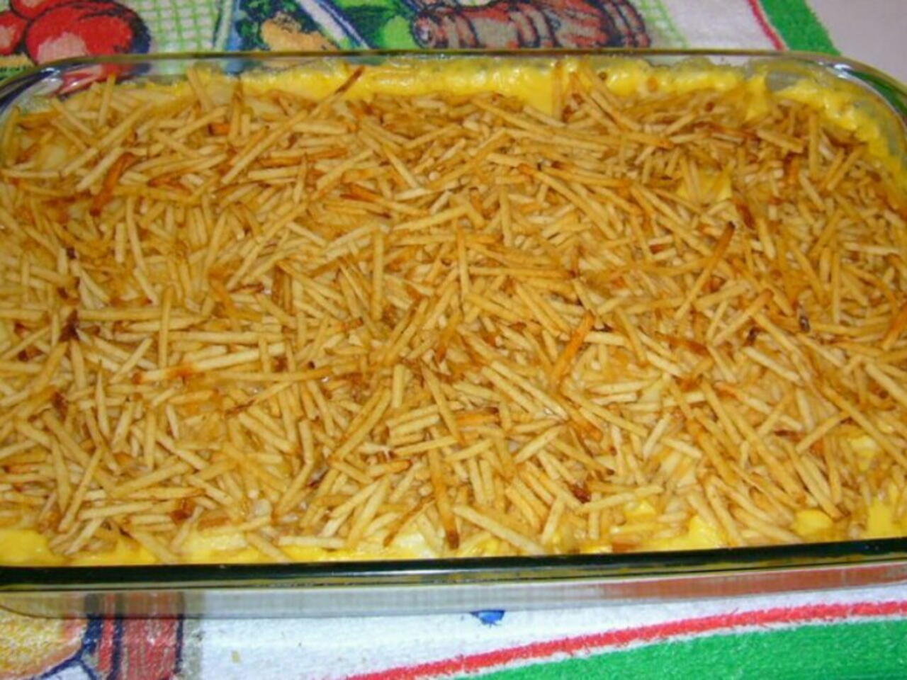 Coloque o refogado numa assadeira, cubra com mussarela e espalhe a batata palha por cima