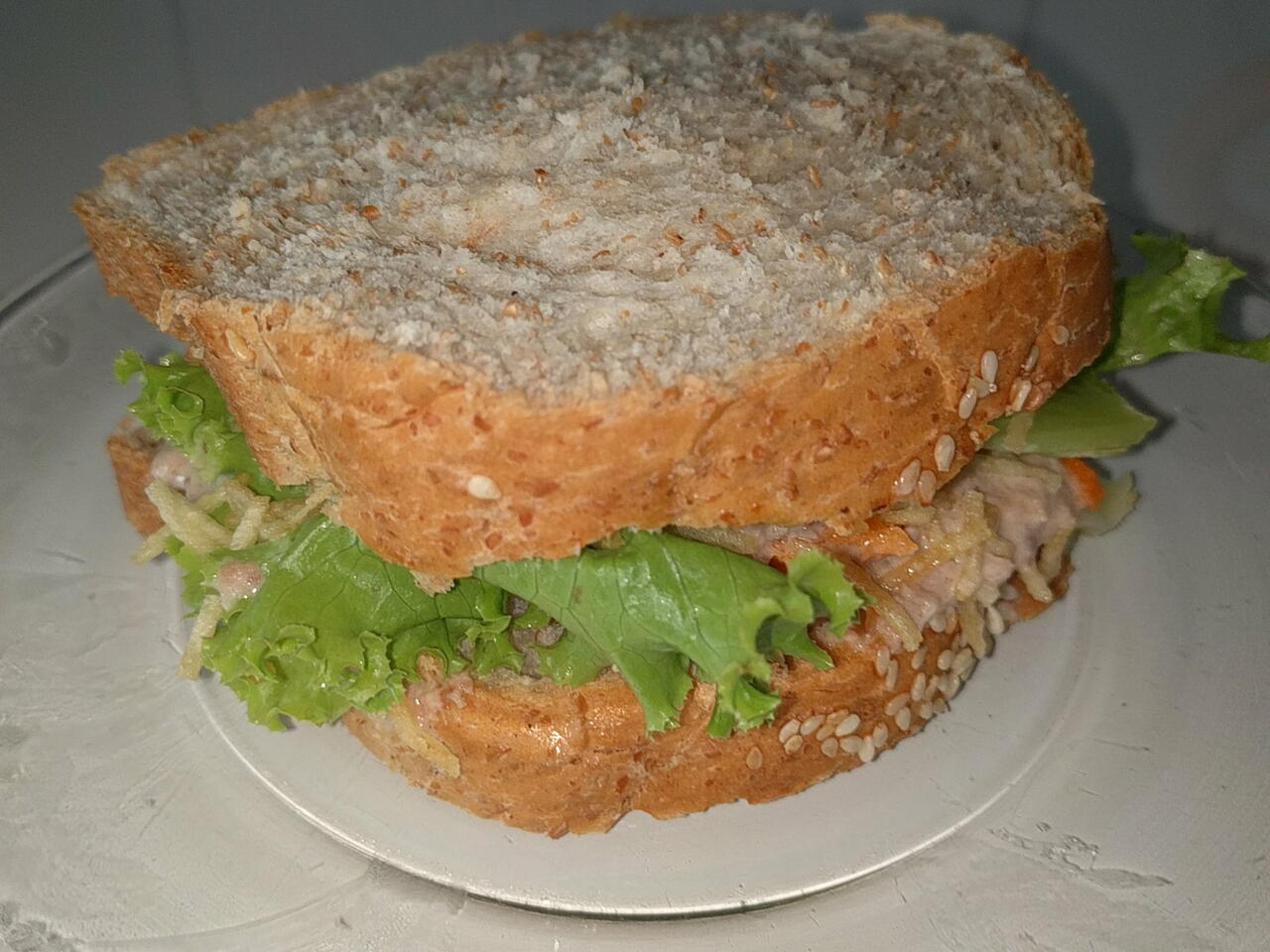 1 fatia de pão, queijo, o patê de atum, cenoura ralada, 1 rodela de tomate