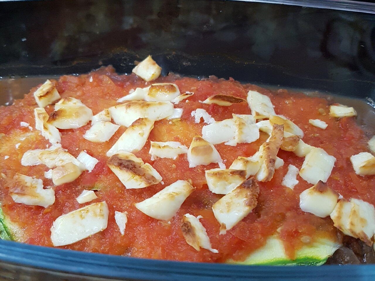 Montar a lasanha colocando uma camada de abobrinha uma do molho bolonhesa uma de abobrinha cobrir com molho vermelho e polvilhar com queijo ralado