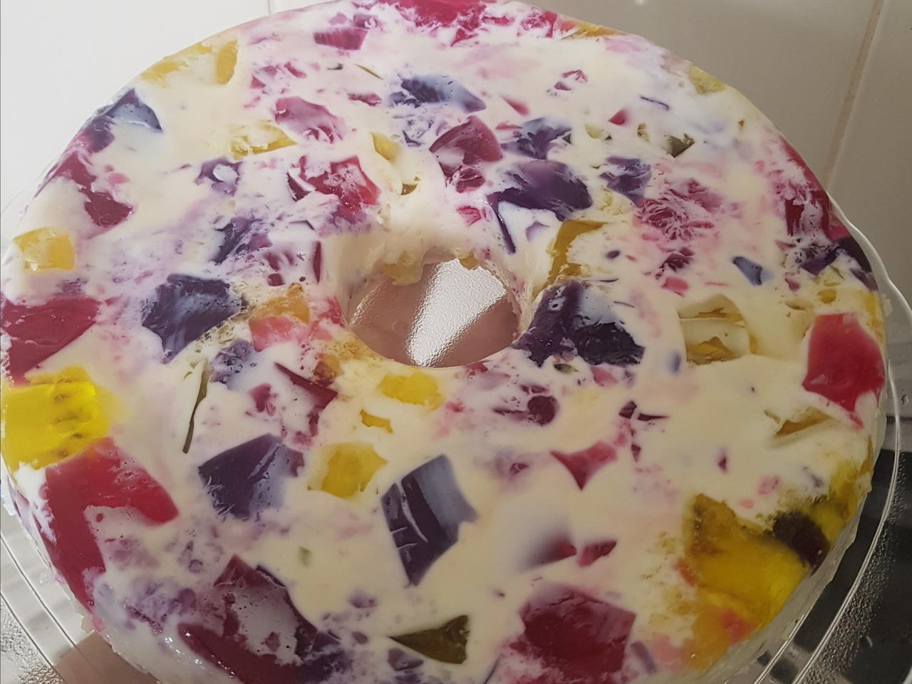 Adicione as gelatinas aleatoriamente. Um pouco de cada e adicione um pouco do líquido do liquidificador, e novamente com a gelatina e por último com o líquido. Pronto, leve para a geladeira para que fique durinha e pronto.