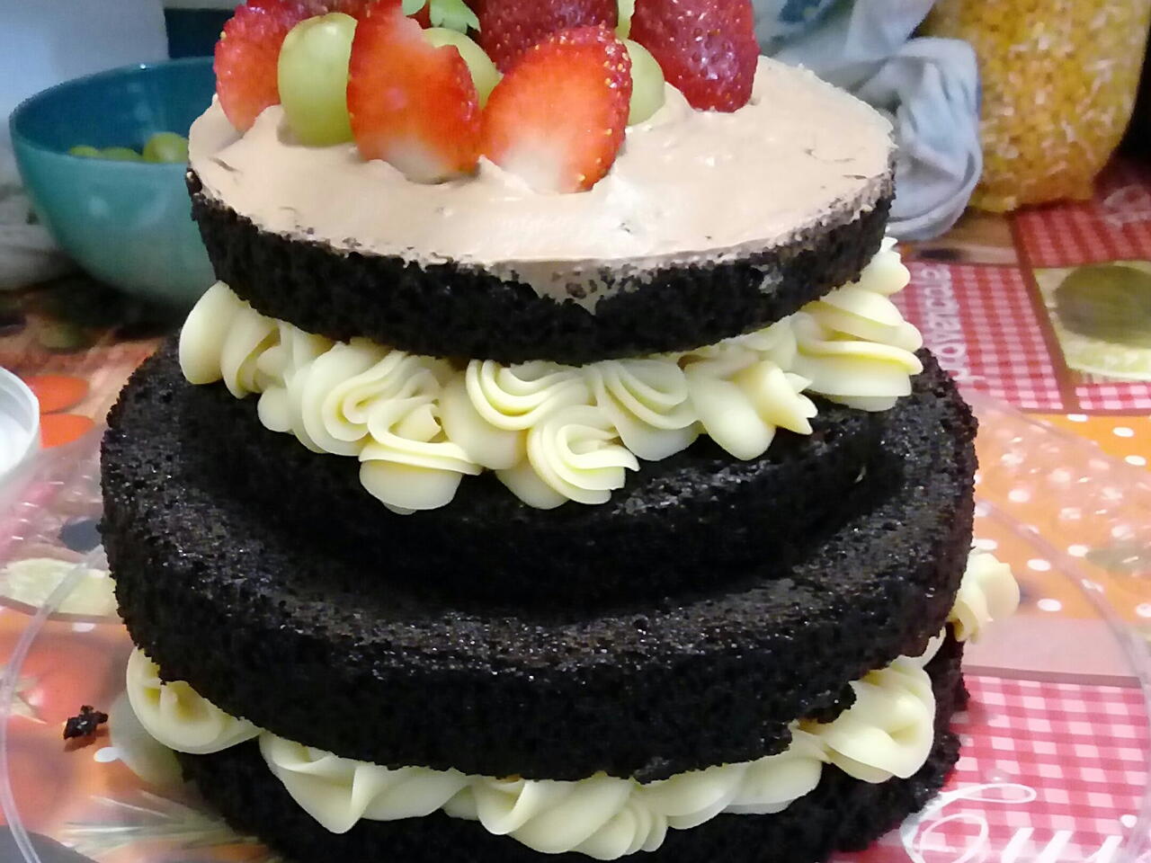 com o brigadeiro,  lembrando de deixar um espaço no meio do bolo e  depois preencher com mais mousse. Por fim no topo do bolo passe mais mousse e decore como desejar. Eu decorei com morangos e uva.