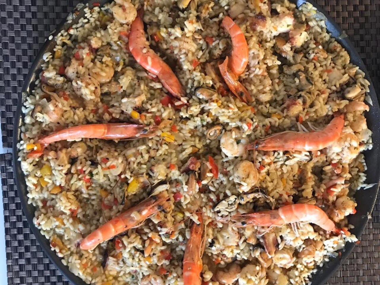 Próximo do arroz estar pronto, ir adicionando os feutoa do mar! Primeiro polvo, depois camarao e por ultimo os mexilhões e os camaroes inteiros q apos assados serão usados para decoração por cima!