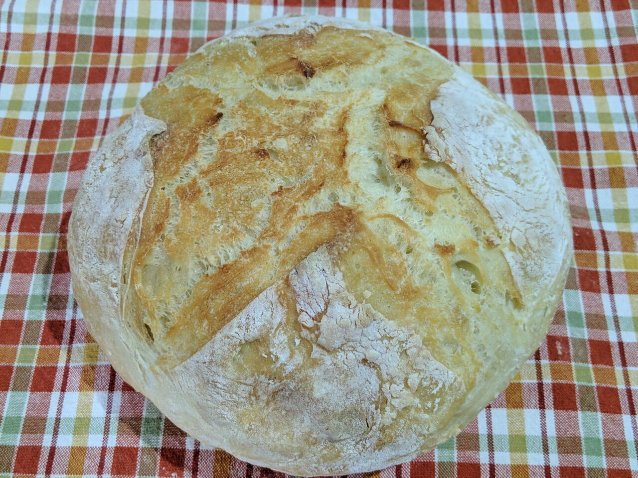 Colocar a massa, fazer uma cruz no centro, colocar a tampa e assar por 15 minutos com tampa, retire a tampa e assar por mais 30 minutos.